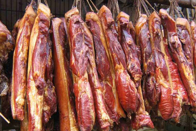臘肉的選料和預處理:選用經(jīng)檢疫合格的新鮮或解凍豬的后腿肉,經(jīng)過剔骨處理,除去肥膘、筋膜,順著肌纖維切成塊,洗去油污。